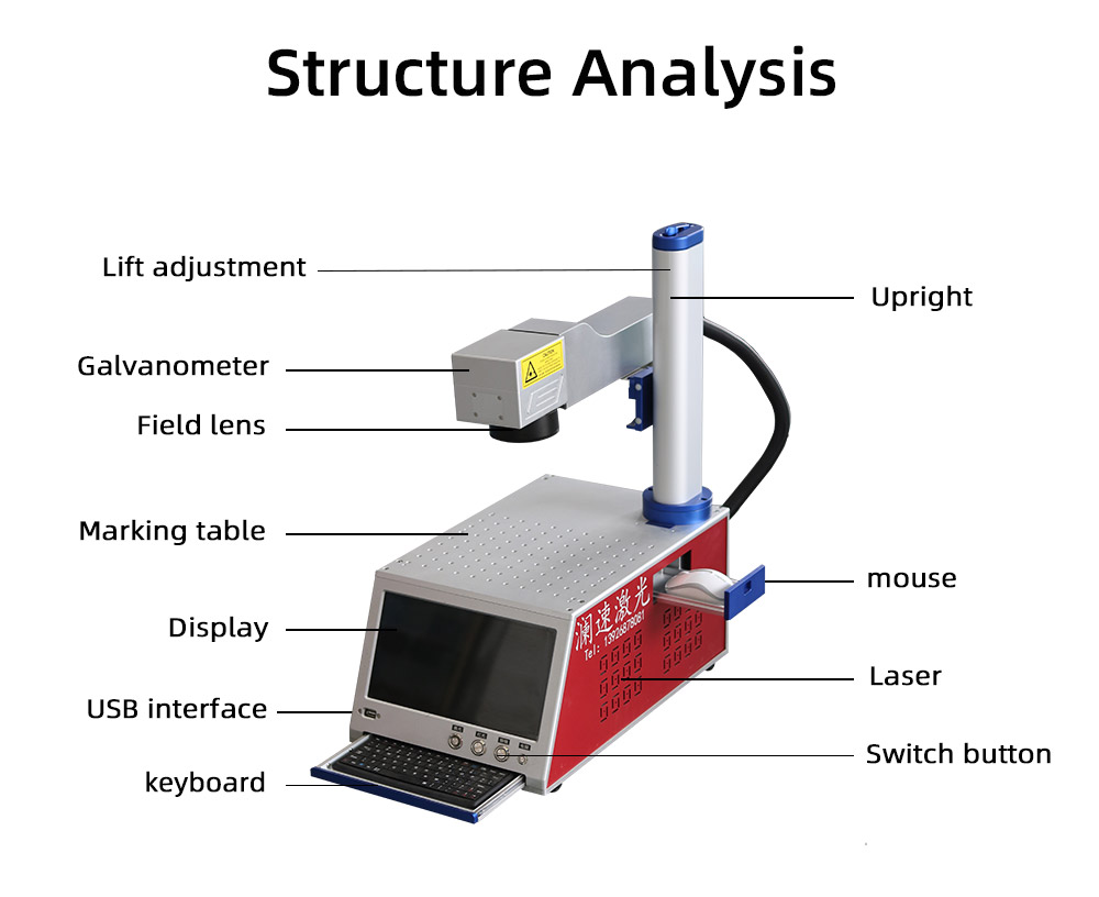 Mini portable laser marking? machineSmall and flexible, the size of the whole machine and the computer main box, 30 kg of the whole machine, laser marking of large mechanical parts in any directi