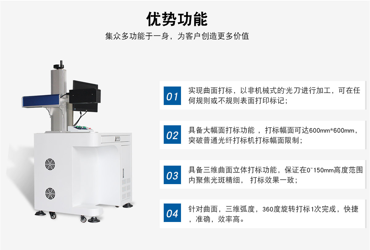 1、3d激光打標(biāo)機,實現(xiàn)曲面打標(biāo),以非機械式的'光刀'進行加工,可在任何規(guī)則或不規(guī)則表面打印標(biāo)記。